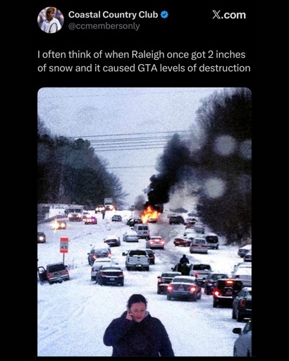 That and municipalities that don’t deal with the shit regularly don’t have annual budgetary expenses carved out to prepare to keep the roads manageable for the once or twice a decade event. I’ve always lived in places where heavy fall and freezing temperatures are expected and yeah, everything is structured around that reality and everyone has more experience with it. I don’t judge a fish for its inability to fly, I’ve always kind of rolled my eyes at people that try to act high and mighty because them and their local municipalities are better prepared to deal with recurrent weather patterns than folks that only have to deal with it in rare circumstances.