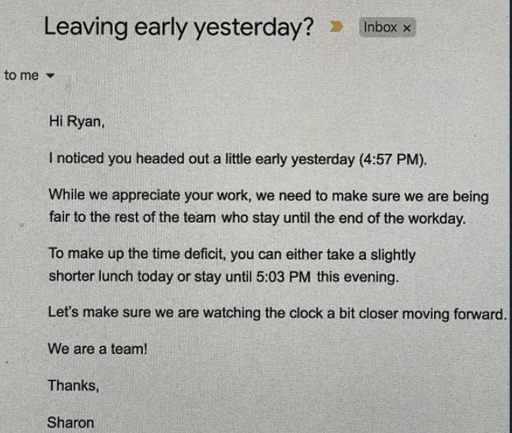 “Find a way to cover this from one of the days that I accidentally took a short lunch or left late, you useless fuck.”
