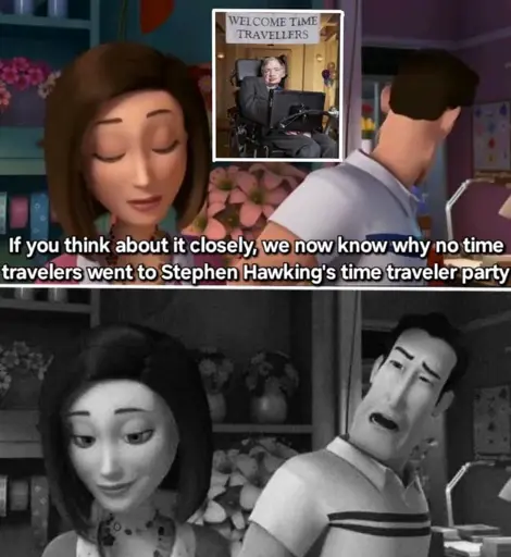 Explanation of the Joke: S. Hawking threw a party for time travelers but only advertised it after the date of the party. this is supposed to be evidence against time travel, but the meme points out that a time traveler probably knows that Hawking is in the Epstein Files and maybe they shunned his party because of that.