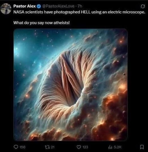 I’d say it looks a little AI generated, for starters, and second I wanna ask a question. If Heaven and Hell are real, why would there be a way for living people to enter from space? I thought the only way to either place was death?