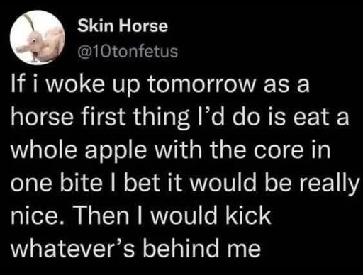 Don’t actually eat the apple whole, that’s dangerous for the horse. The rescue I take my kid to a couple times a year always asks to step on the apple to break it up and make it less of a risk for the horse. Then you can let the horse eat the whole apple