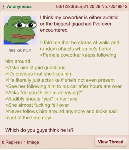 Wouldn’t quite call this “gigachad” behavior, but it’s good and healthy to not jump on literally anyone who offers, even if you aren’t particularly interested. I suspect anon sees this as “gigachad” because they’re steeped in manosphere/incel ideology (unsurprising for a 4chan user).