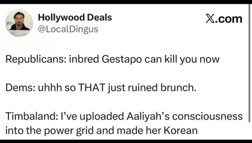 minus-squareflamingo_pinyata@sopuli.xyzlinkfedilinkarrow-up12·8 days agoTimbaland is a music producer, Aaliyah is a singer who’s famously dead. His attempts at some kind of necromancy are news though, he wasn’t known for reviving the dead into Korean powergrid consciousness before.