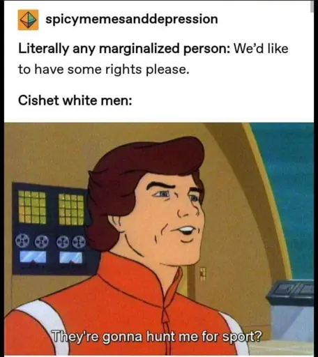 transcription: literally any marginalized person: “wed like to have some rights"please.” cishet white men: “theyre gonna hung me for sport?”