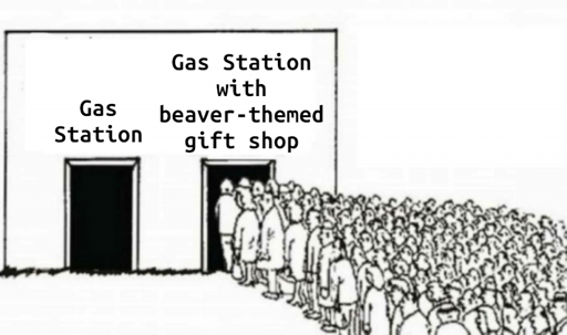In France there’s some really nice gas stations on some of the popular highways. In the summer there’s so many tourists going on vacation through these that some of them even set up temporary art exhibitions or special activities like bouldering, bow&arrows, etc. I remember doing my first “dive” in a special water cube on the parking lot of Montélimar’s station when I was a kid, good times. Of course none of that is even remotely similar to putting a beaver themed slop-shop and calling it a day, the shops mostly just sell local products and the usual essentials.