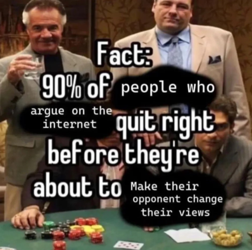 I find when you stop arguing to change others opinions and start arguing because its fun you liberate yourself. I feel no need to make a reactionary, a shitlib, or a bootlicker change their views when pointing out the absurdity of their arguments can easily convince people silently watching.