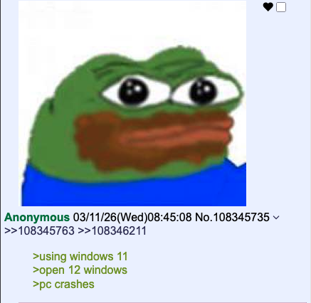kali_fornication@lemmy.world to Greentext@sh.itjust.works · 1 month agoAnon uses his computerlemmy.worldimagemessage-square12linkfedilinkarrow-up1330arrow-down16