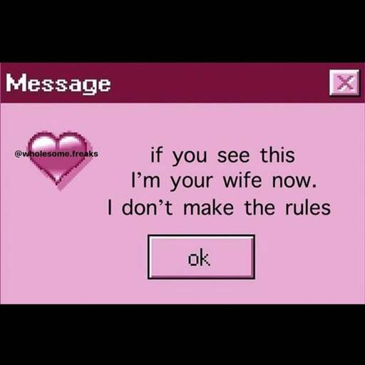 you know what thats so real girlboss, updated it for youYeah idk how “I’m your wife now” is horny, or really any of your relationship posts. Unless they assume the primary reason for a relationship is sex, or they assume your primary reason for a relationship is sex, which says a lot more about them.