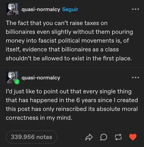A billionaire is a mentally broken hoarder. They don’t collect every newspaper and urine sample but something more dangerous. They collect resources, more than any person could use without disgusting amounts of waste. Those collections come at the detriment to all human existence and should be viewed as a mental disease. We need to bring back sanitariums to hold these broken and diseased people so that they cannot continue to harm society.