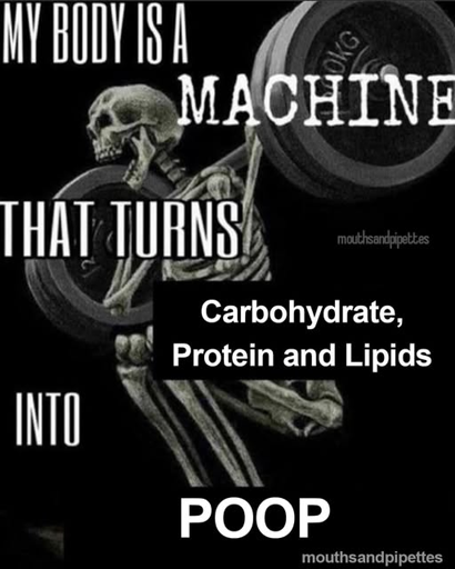 WRONG, you absorb most of that and eventually turn into CO2 and urea (protein), poop is mostly indigestible stuff and bacteria + bile (digested old blood cells)