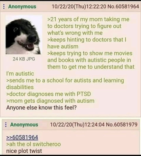 When someone imposes a diagnosis on you that is wrong and does it for selfish reasons, when you are a child, it is very harmful. It hurts your feeling of self worth to the core and makes you constantly question yourself and who you are. It takes a lot of strength to stop the selfdoubt and finally conclude that you do not have autism and that what you feel and think is correct and not what you have been told all your life by the people you were supposed to be able to trust. That is really a very difficult thing to do, because the anxiety that something is “wrong” with you after all is always there. It takes courage.