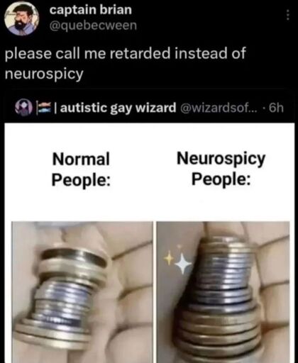 For the love of god please do not diagnose yourself as being “neurospicy” based solely on if you like stacking coins by size 😭🙏