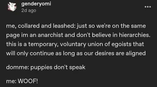transcription: me, collard and leashed: just so were on the same page im an anarchist and i dont believe in hierarchies, this is a temporary union of egoists that will only continue as long as our desires are aligned. domme: puppies dont speak. me: WOOF!