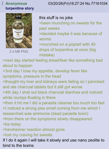 Activated charcoal is a decent idea within a few hours. Days after you’ve ingested fucking turpentine, you’ve long since passed the point of no return. From what I recall, charcoal prevents additional absorption, it doesn’t leech out poison like some sort of magic second liver.