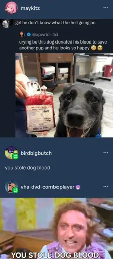 i think its probably positive to make the decision for healthy dogs, to take their blood to a responsible extend, forcing them (or allowing them) to participate in a higher act of solidarity and mutual aide than they can comprehend, … but i also think its still blood stealing and the post is funny