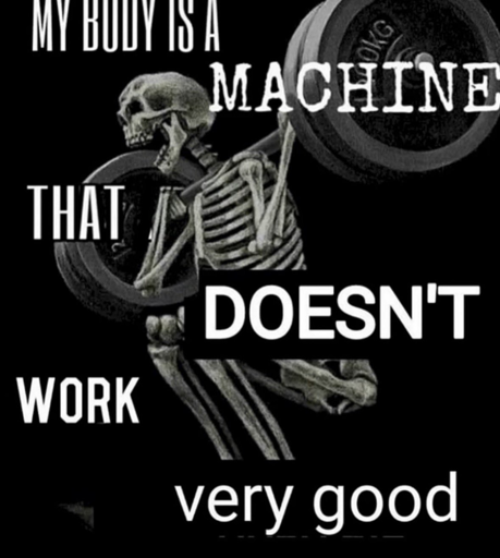 Image of skeleton lifting a barbell on the shoulders, overlaid with text: My body is a MACHINE That Doesn’t work Very good