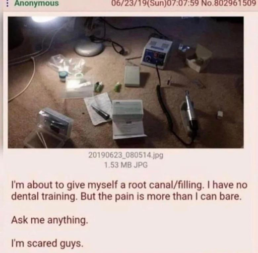 🍹Early to RISA 🧉@sh.itjust.worksM to Greentext@sh.itjust.works · 2 years agoAnon isn't a dentistsh.itjust.worksimagemessage-square4linkfedilinkarrow-up10arrow-down10