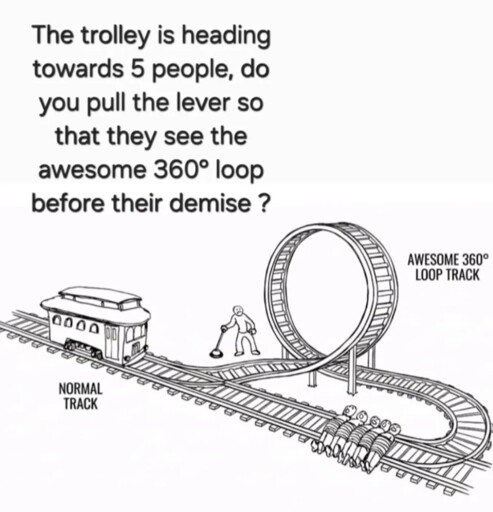 minus-squareShaper@lemmy.worldlinkfedilinkarrow-up27·23 hours agoI’d pull the lever cause it’s going to derail on that u-turn for sure