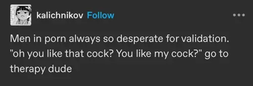 genuinely have to turn porn off sometimes because the man is both the worst actor on the face of the earth and also won’t shut the fuck up which completely kills the experience