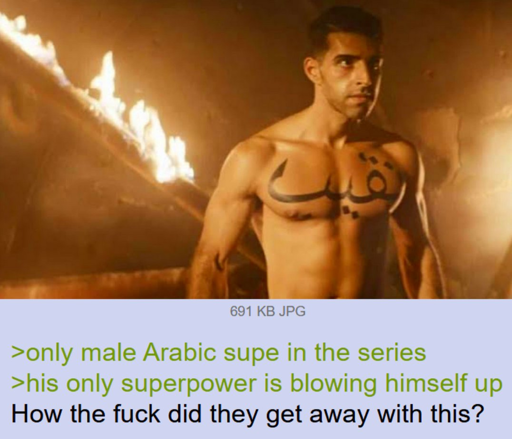 The existential horror of suicide bombing is implicit in the nihilism of the bomber, an individual who believes their only value to society is as a personification of military technology. The show doesn’t explore this at all. The character doesn’t have any character. He’s just a throw-away threat used to explain another Supe’s disfigurement.