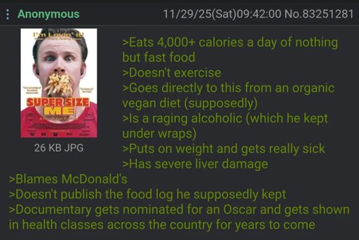 I think one of the reasons he did it was an executive from McDonald’s had stated that their food was healthy and someone could eat it everyday for a month without health consequences. His goal was to prove this was an obvious lie. Secondly how many low income people are stuck in a system where this is the only food that is conveniently available and how that is making generations of low-income households sick.