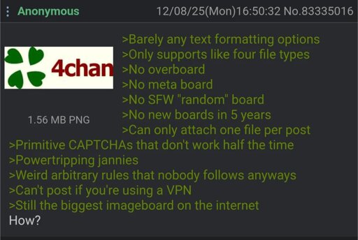I love it for what its for, but “imageboard” really ain’t it, and has never been what it was known for. Might as well preach the glory/legitimacy of Pepe NFTs as that narrative.