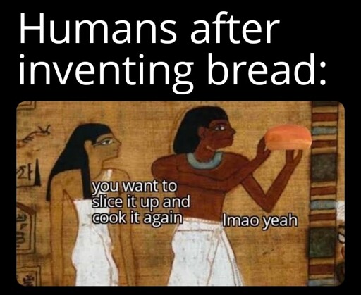minus-squarems.lane@lemmy.worldlinkfedilinkEnglisharrow-up2arrow-down1·2 days ago humans after inventing bread f a t