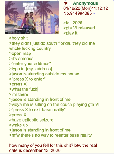 arrow-up1247arrow-down1imageAnon plays GTA VIlemmy.worldkali_fornication@lemmy.world to Greentext@sh.itjust.works · 2 months agomessage-square13linkfedilink