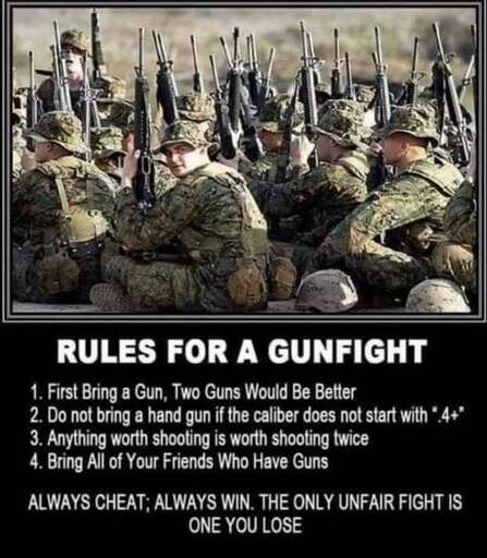 arrow-up1270arrow-down1imageRules for a gun fightlemmy.worldSine_Fine_Belli@lemmy.world to Lemmy Shitpost@lemmy.world · 1 day agomessage-square43linkfedilinkfile-textcross-posted to: memesforliberalgunowners@lemmy.world