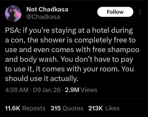 I shower twice a year whether I need it or not and it’s not my problem if that schedule coincides with the furcon thank you very much.
