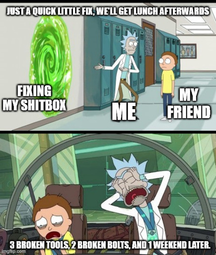 I feel you on that man, every time I’ve had to work under my first gen CRV (it’s a 2000 model year, made at he end of 1999) it’s turned into a weekend project.