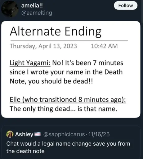 tgirlschierke@lemmy.blahaj.zone to Animemes@ani.socialEnglish · 24 days agoAlternate Ending [Death Note]lemmy.blahaj.zoneimagemessage-square0linkfedilinkarrow-up11arrow-down10