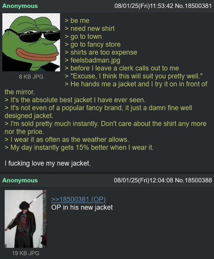 throwawaybanana@discuss.online to Greentext@sh.itjust.works · 7 months agoAnon gets a new jacket.discuss.onlineimagemessage-square4linkfedilinkarrow-up10arrow-down10